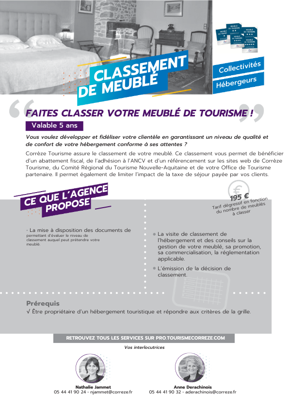 Corrèze Tourisme assure le classement de votre meublé. Ce classement, valable 5 ans, vous permet de bénéficier d’un abattement fiscal, de l’adhésion à l’ANCV, limiter l’impact de la taxe de séjour payée par vos clients et d’un référencement sur les sites Web de Corrèze Tourisme, du Comité Régional du Tourisme Nouvelle Aquitaine et de votre Office de Tourisme partenaire.